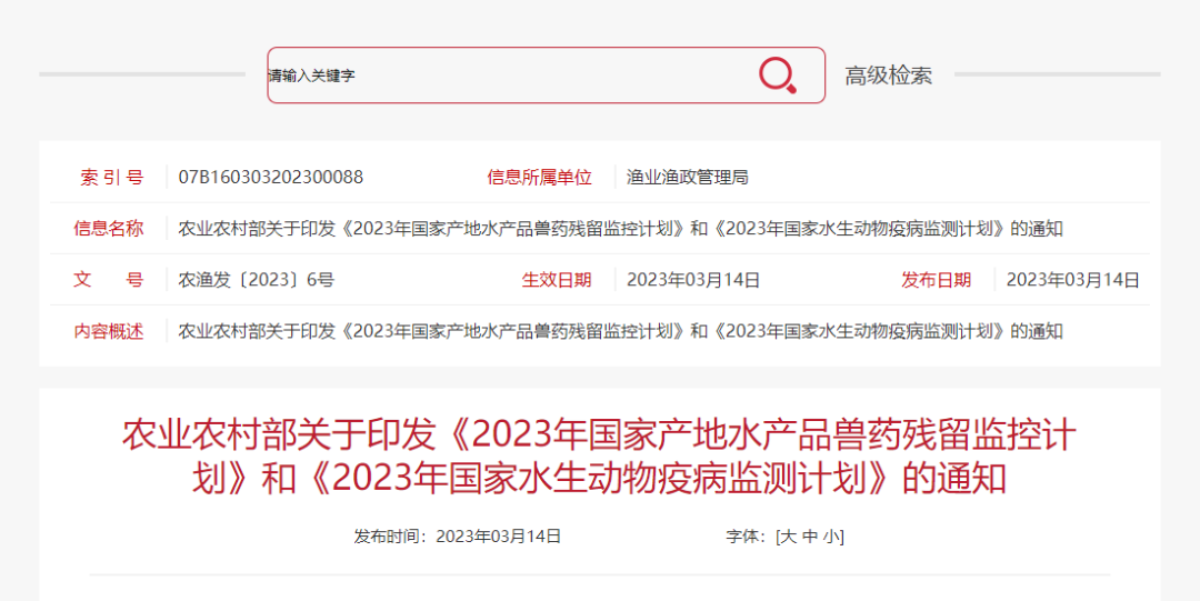 各省、自治區(qū)、直轄市農業(yè)農村(農牧)、漁業(yè)廳(局、委),計劃單列市漁業(yè)主管局,新疆生產建設兵團農業(yè)農村局,各有關單位: 為提升養(yǎng)殖水產品質量安全和生物安全水平,保障水產品安全有效供給,推進水產養(yǎng)殖業(yè)綠色高質量發(fā)展,根據《中華人民共和國漁業(yè)法》、《中華人民共和國農產品質量安全法》、《中華人民共和國動物防疫法》、《獸藥管理條例》等法律法規(guī),我部制定了《2023年國家產地水產品獸藥殘留監(jiān)控計劃》、《2023年國家水生動物疫病監(jiān)測計劃》?,F(xiàn)印發(fā)給你們,請認真組織實施執(zhí)行。有關要求通知如下。 (一)農業(yè)農村部漁業(yè)漁政管理局負責監(jiān)督管理水產養(yǎng)殖用獸藥及其他投入品的使用,負責提出和組織國家產地水產品獸藥殘留監(jiān)控計劃和國家水生動物疫病監(jiān)測計劃,發(fā)布監(jiān)控(測)結果,組織分析研判養(yǎng)殖水產品的質量安全和養(yǎng)殖水生生物的生物安全形勢。 (二)中國水產科學研究院(以下稱“水科院”)負責具體組織實施國家產地水產品獸藥殘留監(jiān)控計劃,對各地監(jiān)控工作給予技術指導。中國水產科學研究院質量與標準研究中心(以下稱“水科院質標中心”)負責國家產地水產品獸藥殘留監(jiān)控計劃抽檢結果的匯總、分析和會商等工作。國家水產品質量監(jiān)督檢驗中心等水產品質檢機構(以下稱“質檢機構”)負責協(xié)助開展國家產地水產品獸藥殘留監(jiān)控計劃的抽樣、檢測和結果報送等工作。 (三)全國水產技術推廣總站負責具體組織實施國家水生動物疫病監(jiān)測計劃,組織各省級水生動物疫病預防控制(水產養(yǎng)殖病害防治、水產技術推廣)機構(以下稱“省級水生動物疫控機構”),協(xié)調水生動物疫病參考實驗室和相關檢測機構,開展全國水生動物疫病監(jiān)測,指導各省份開展監(jiān)測、凈化與評估工作;組織首席專家開展監(jiān)測信息的分析評估、疫病形勢會商和疫情預警工作;及時完成監(jiān)測結果匯總、分析和上報;發(fā)生突發(fā)水生動物疫情時,及時組織開展緊急監(jiān)測診斷處置工作。負責國家產地水產品獸藥殘留監(jiān)控計劃中水產養(yǎng)殖動物主要病原菌耐藥性監(jiān)測的具體組織實施工作,負責組織各級水產技術推廣機構和相關專家開展水產養(yǎng)殖用藥減量行動和規(guī)范用藥科普下鄉(xiāng)活動,及時調度各地工作情況和總結。 (四)省級主管部門負責組織實施本轄區(qū)內國家產地水產品獸藥殘留監(jiān)控計劃和國家水生動物疫病監(jiān)測計劃,加強產地水產品獸藥殘留管控,做好水生動物疫病防控,制定和組織實施省級產地水產品獸藥殘留監(jiān)控(監(jiān)督抽查)計劃和水生動物疫病監(jiān)測計劃,對轄區(qū)內各級主管部門開展的產地水產品獸藥殘留監(jiān)控和水生動物疫病監(jiān)測等工作進行指導。 (一)加強組織領導。加強養(yǎng)殖水產品質量安全監(jiān)管和養(yǎng)殖水生生物疫病防控是保障水產品安全有效供給的基礎。地方各級農業(yè)農村(漁業(yè))主管部門務必要高度重視這兩項工作,強化組織領導,細化職責分工,壓實各級責任,加強部門聯(lián)動,不折不扣地完成國家產地水產品獸藥殘留監(jiān)控計劃和國家水生動物疫病監(jiān)測計劃的各項工作任務。 (二)強化經費保障。依據《中華人民共和國農產品質量安全法》、《中華人民共和國動物防疫法》等法律,各地農業(yè)農村(漁業(yè))部門要將產地水產品獸藥殘留監(jiān)控和水生動物疫病監(jiān)測工作納入本級財政預算,落實監(jiān)管責任,確保工作取得實效。國家產地水產品獸藥殘留監(jiān)控計劃和國家水生動物疫病監(jiān)測計劃中國家負責部分所需經費納入中央財政預算。 (三)推進源頭治理。地方各級農業(yè)農村(漁業(yè))主管部門要持續(xù)加強水產品質量安全和水生生物生物安全的源頭管控,結合水產綠色健康養(yǎng)殖技術推廣“五大行動”的實施,推廣生態(tài)健康養(yǎng)殖技術模式,升級基礎設施裝備,配套水產良種和防病技術,規(guī)范日常管理和獸藥使用,持續(xù)提升養(yǎng)殖主體的質量安全和疫病防控意識。相關省份要開展海參和牛蛙養(yǎng)殖用藥專項整治“回頭看”工作,嚴厲打擊養(yǎng)殖生產中違法用藥行為。 (四)加強協(xié)作配合。地方各級農業(yè)農村(漁業(yè))主管部門及執(zhí)法機構要統(tǒng)籌協(xié)調好漁業(yè)與獸藥、飼料、農藥、質量安全等部門的聯(lián)合監(jiān)管和執(zhí)法協(xié)作,持續(xù)深化食用農產品“治違禁、控藥殘、促提升”三年行動,合力實施更為嚴厲的全程監(jiān)管,規(guī)范執(zhí)法程序,做好行刑銜接,加大對相關違法行為的打擊力度,共同提高養(yǎng)殖水產品質量安全水平。 附件:1. 2023年國家產地水產品獸藥殘留監(jiān)控計劃 2. 2023年國家水生動物疫病監(jiān)測計劃