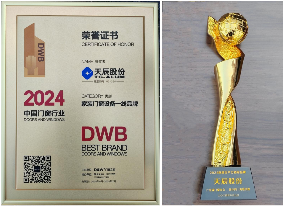 ??在會議的頒獎典禮上,天辰股份榮獲會議晚宴總冠名、“家裝門窗設(shè)備一線品牌”以及“新質(zhì)生產(chǎn)力領(lǐng)軍品牌”的榮譽。