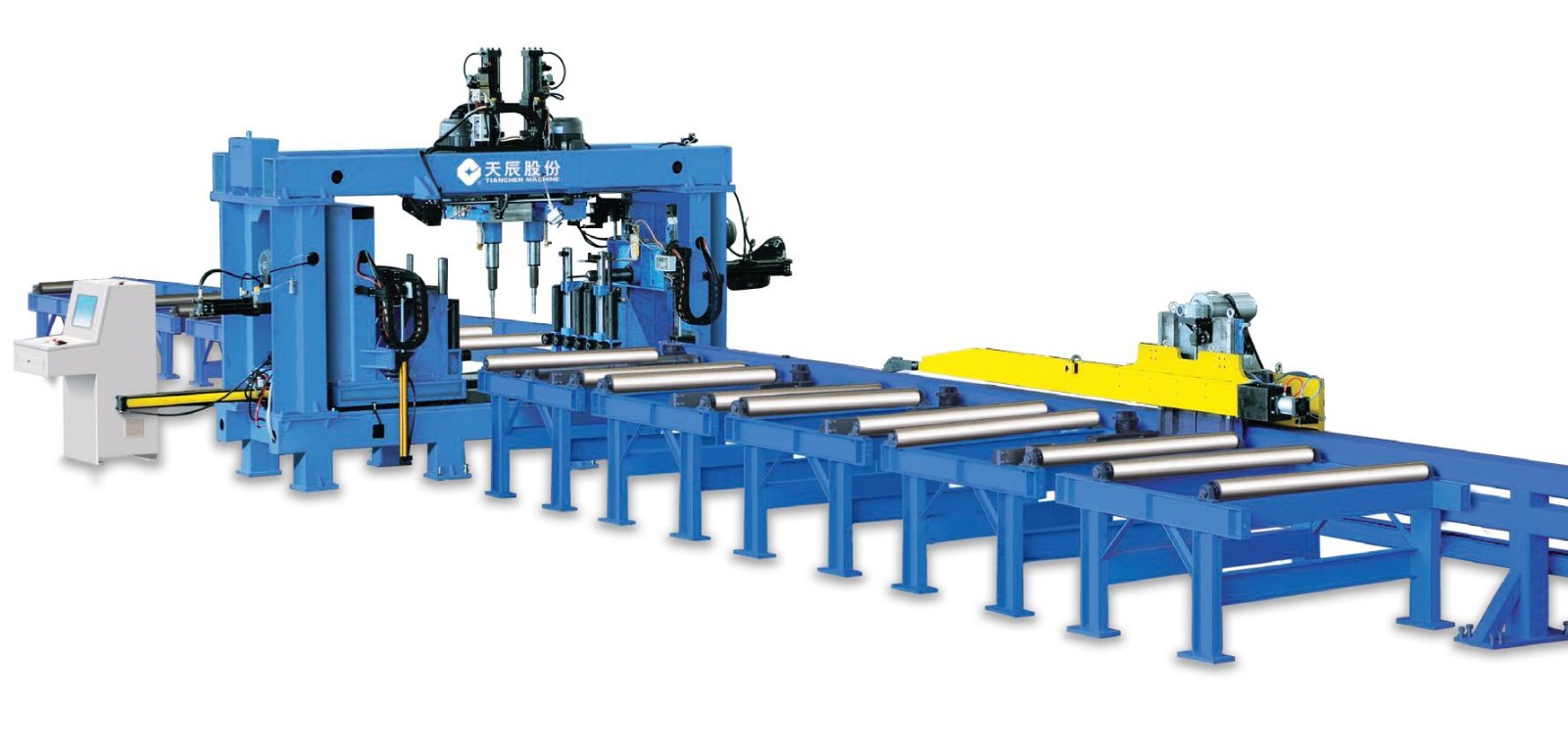 本機床主要用于對H型鋼、槽鋼、方管和矩形管等型鋼進(jìn)行鉆孔加工,它主要應(yīng)用于鋼結(jié)構(gòu)建筑、橋梁、電站、海洋石油井平臺、塔桅等鋼結(jié)構(gòu)行業(yè)。機床一共采用4個主軸: 左單元和右單元各有1個主軸分別對型鋼的兩個翼板進(jìn)行鉆孔加工;上單元有2個主軸,對型鋼的腹板進(jìn)行鉆孔加工。上單元能裝夾2種不同直徑的鉆頭,可以同時加工腹板上兩種不同直徑的孔。和腹面上只有單個主軸的機床相比,當(dāng)腹板孔徑變化時不需要手工更換鉆頭,因此該機床大大節(jié)省了換刀時間,顯著提高了加工效率和加工精度。該機床是我公司專利產(chǎn)品