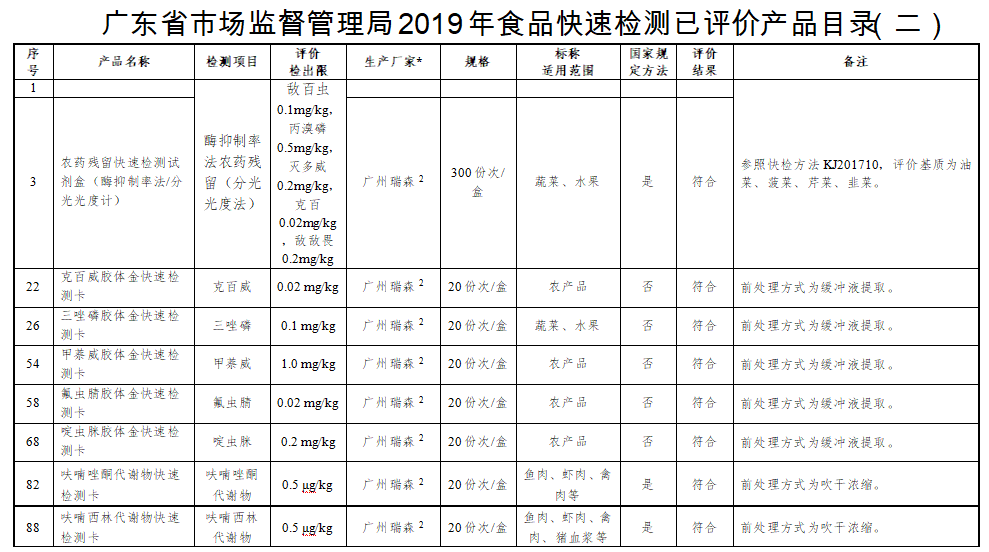 由廣東省市場監(jiān)督管理局組織廣東省食品檢驗所開展的快速檢測產(chǎn)品現(xiàn)場驗證活動,于近日公布結(jié)果。廣州瑞森生物科技股份有限公司參與的克百威快速檢測卡、甲萘威快速檢測卡以啶蟲脒快速檢測卡等11種快檢產(chǎn)品通過現(xiàn)場驗證。