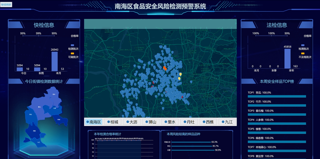 所有檢測信息均會實時上傳食品安全風(fēng)險檢測預(yù)警系統(tǒng),系統(tǒng)設(shè)置“今日鎮(zhèn)街檢測數(shù)據(jù)統(tǒng)計”“本年檢測合格率”“本周風(fēng)險較高的樣品品種”“本周安全用品TOP”“快檢信息”“法檢信息”六大模塊內(nèi)容,對收集到的數(shù)據(jù)進(jìn)行分析,形成“南海區(qū)食品快檢數(shù)據(jù)”地圖。