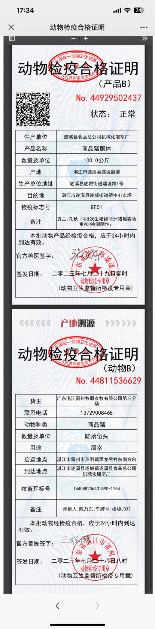 7月29日凌晨12點(diǎn)57分,遂溪縣食品總公司機(jī)械化屠宰廠的駐場(chǎng)官方獸醫(yī)開出了湛江市首張動(dòng)物檢疫合格證明(產(chǎn)品B)電子證照,這是繼本月初無(wú)紙化出具動(dòng)物B證后,湛江市動(dòng)物檢疫工作在信息化建設(shè)上又一次新的突破;標(biāo)志著湛江市動(dòng)物檢疫合格證明無(wú)紙化改革工作、全鏈條檢疫追溯監(jiān)管體系建設(shè)又邁出了歷史性的一步,成為全省首個(gè)在產(chǎn)地檢疫與屠宰檢疫環(huán)節(jié)同時(shí)實(shí)現(xiàn)無(wú)紙化出證的地級(jí)市。
